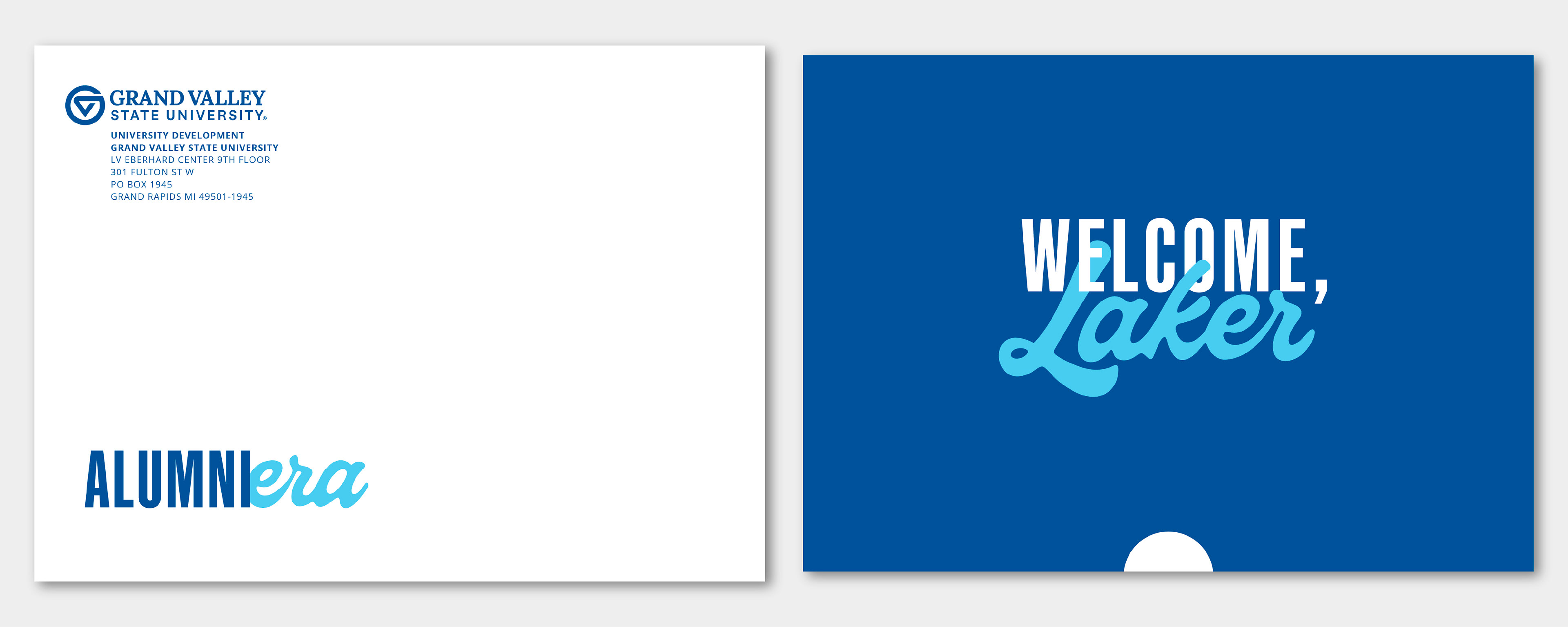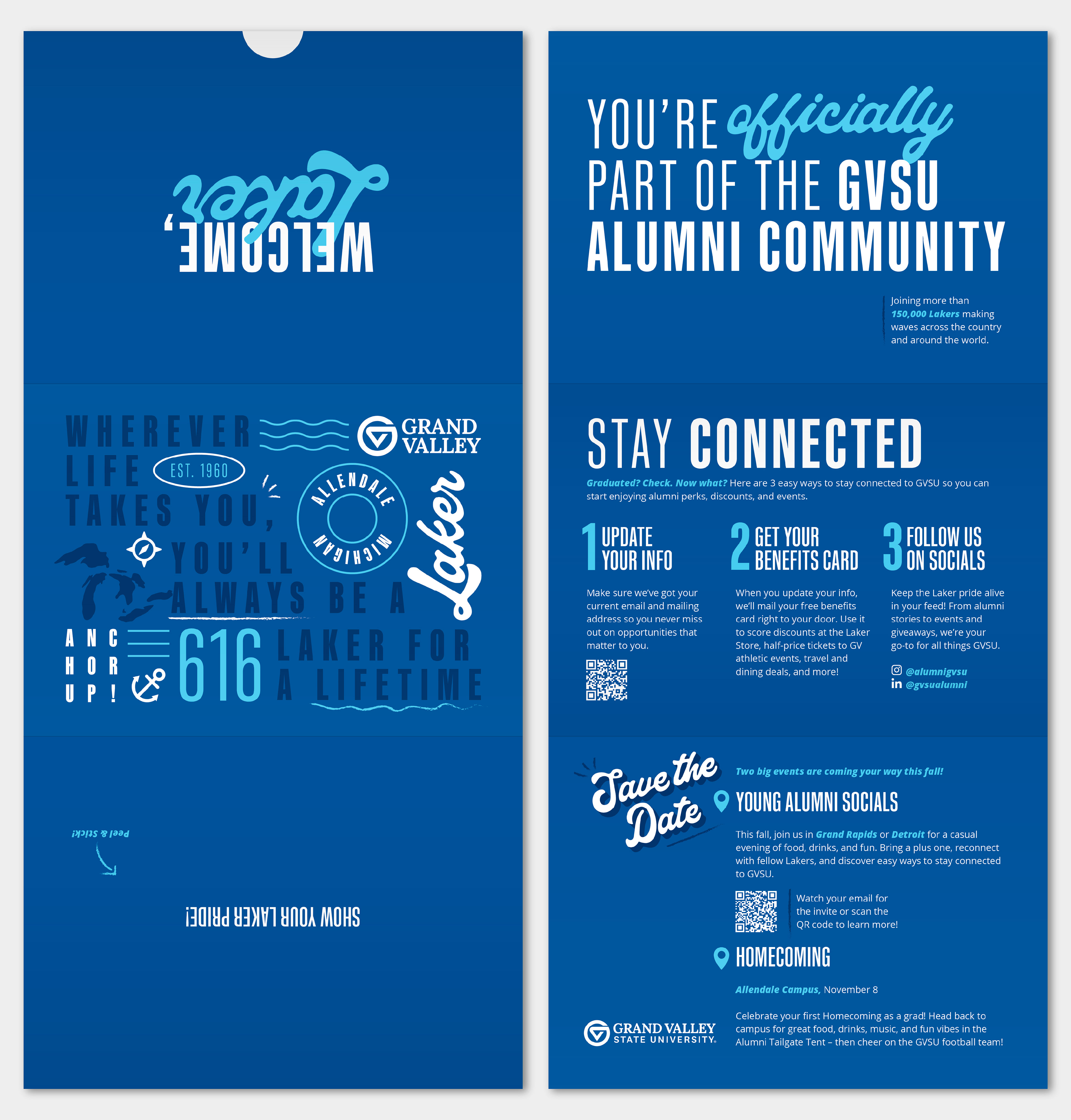 ‘Laker for a Lifetime’ is a mantra used by Grand Valley State University students and alumni to express their school pride, create community and foster affinity for the school. The Alumni Relations team at GVSU reached out to me with a request for a set of direct mail pieces to be sent to newly graduated alumni – encouraging them to stay connected to their campus community after they have graduated. This presented a unique opportunity to develop an updated 'Laker for a Lifetime' logo and visual identity to be used in all alumni facing communications going forward. The final deliverables included an envelope, tri-fold card, and peel-off sticker for new grads to display their Laker Pride wherever their professional journeys may take them.