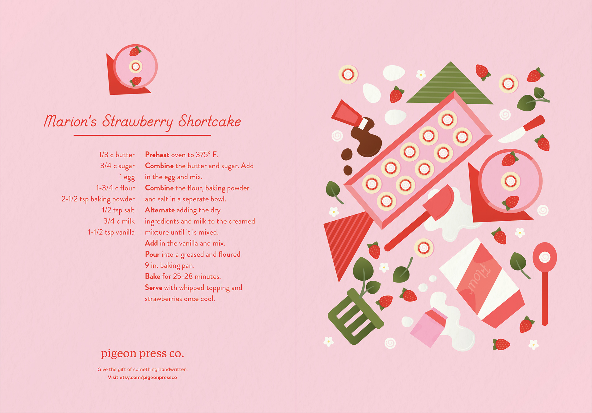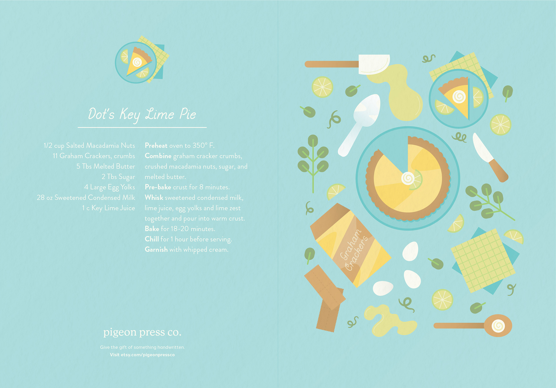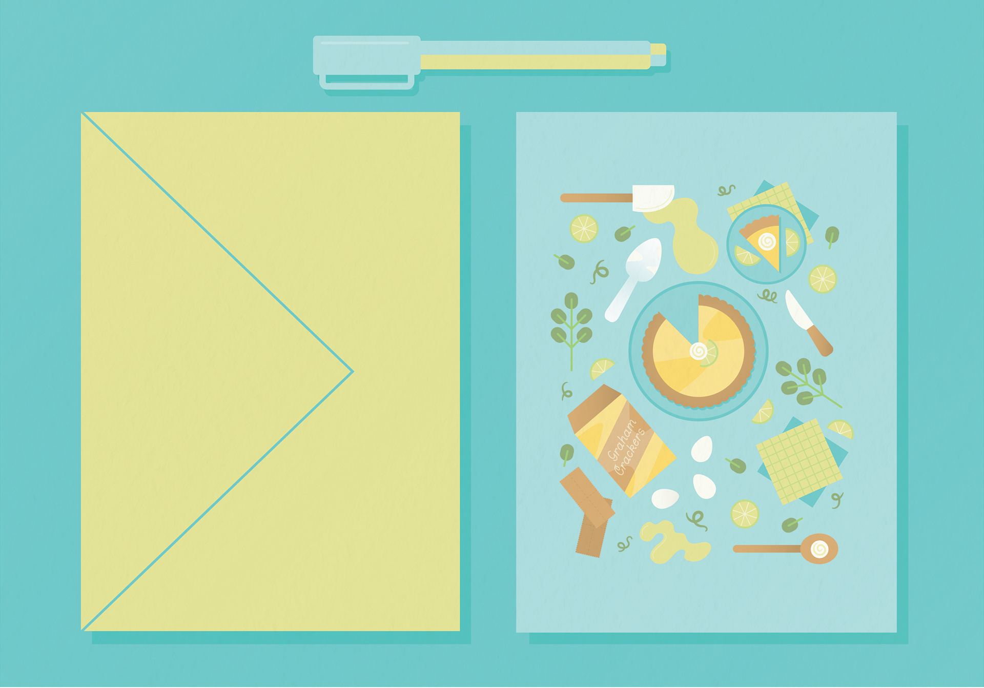 These cards represent the first installment in a series of Seasonal Recipe Greeting Cards. The summer designs are inspired by recipes that have been handed down in my family from generation to generation and are named after a family member. I began each design by looking at the recipe and deciding which ingredients and kitchen utensils to include. I then did a primary sketch using Procreate before refining the illustrations in Adobe Illustrator.